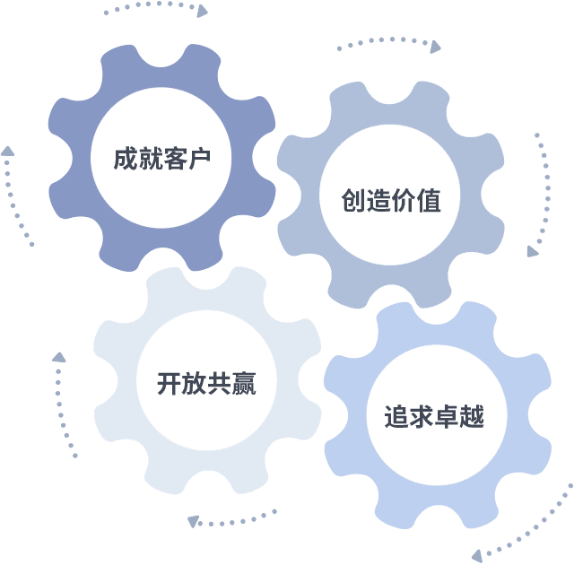 成就客户是一切决策的出发点,,,创造价值是衡量所有工作的标准,,,,追求卓越是我们做事做人的态度,,,,开放共赢是我们的格局也是最终的结果。。价值观的齿轮环环相扣,,,推动着组织里的每个人不断向前。。。